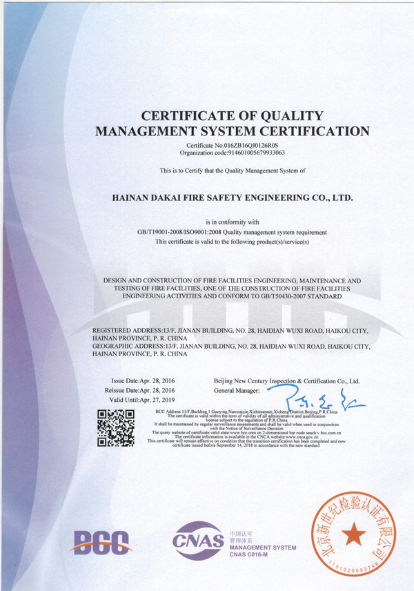 大凱消防順利獲得質(zhì)量管理體系認(rèn)證證書